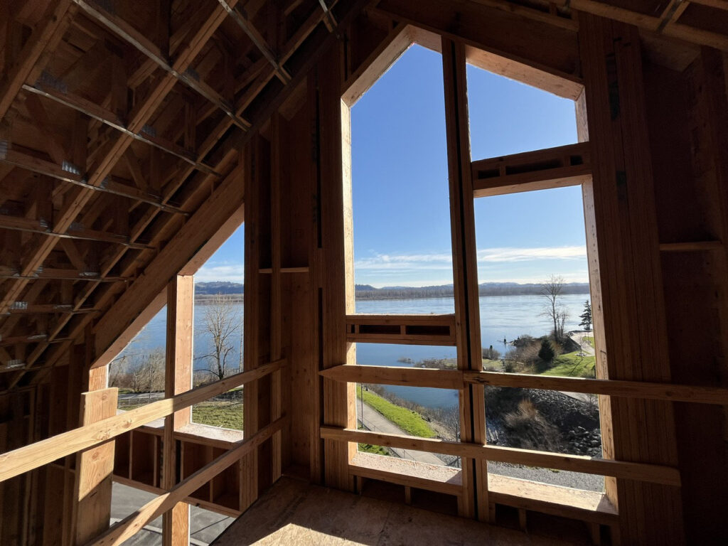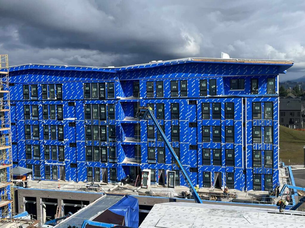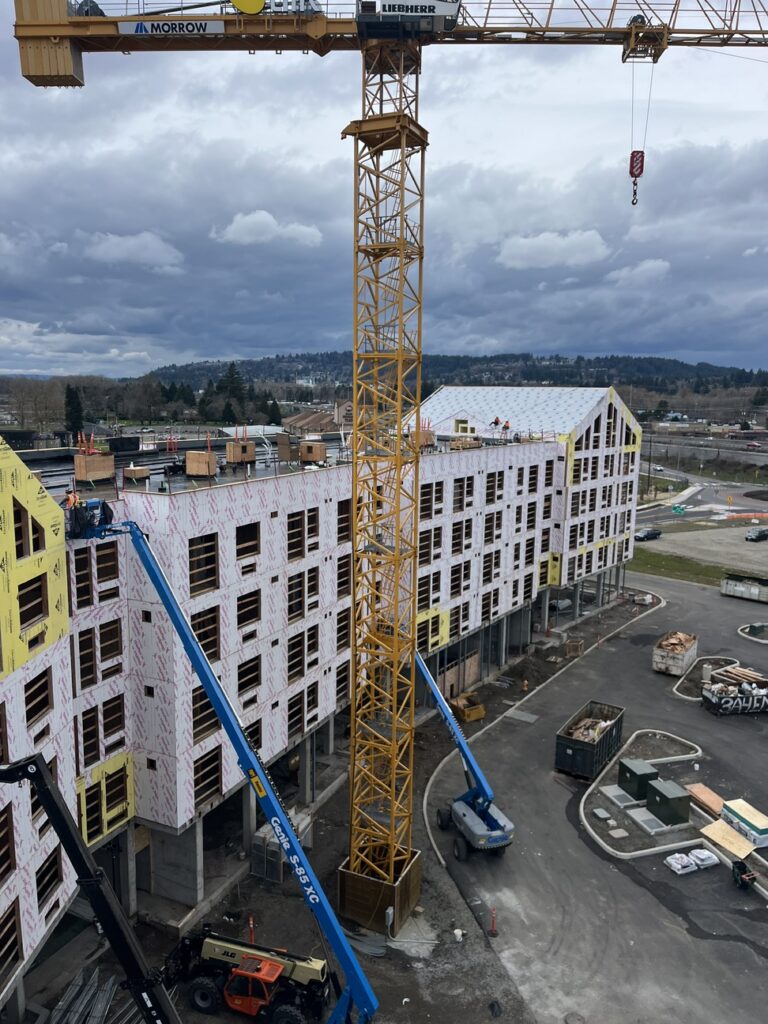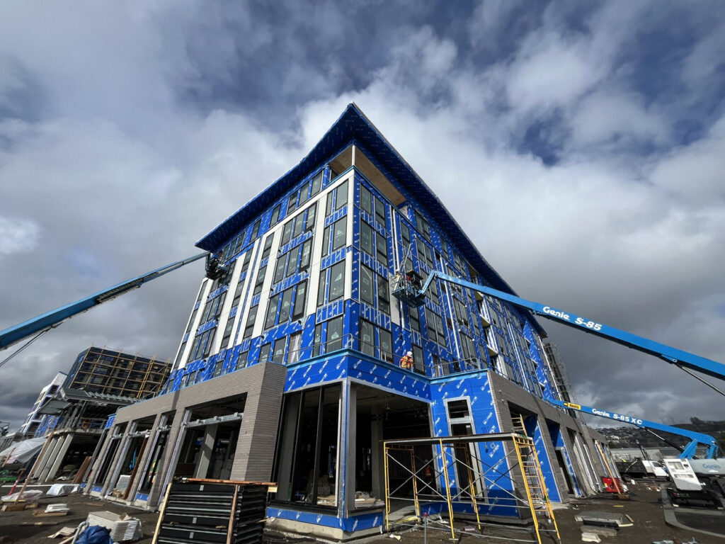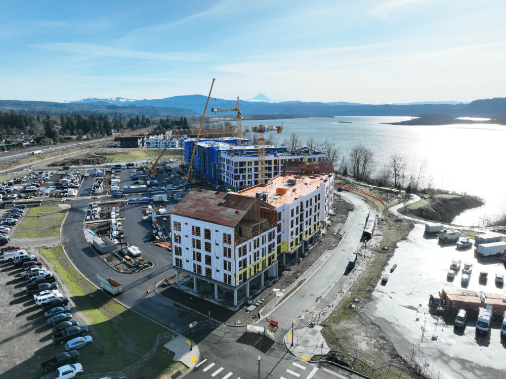 February brought rainy weather with some sunshine breaks, and it was a busy month with framing nearing its end with the completion of the lofted roofs at Klipsan (Building A). The view from the loft units – the final ones completed – are quite spectacular! Broadrock (Building C) and Cascara (Building D) are both wrapping up their final floor of drywall, and the exterior siding is going up across both buildings, both up on the upper floors as well as down at the storefront level. Cabinets started installing inside Broadrock and we are getting very regular deliveries on site as the buildings seal up and the units start looking livable. With daylight savings in a few days and the start of spring on the horizon, we look forward to a drier site and more daylight hours.