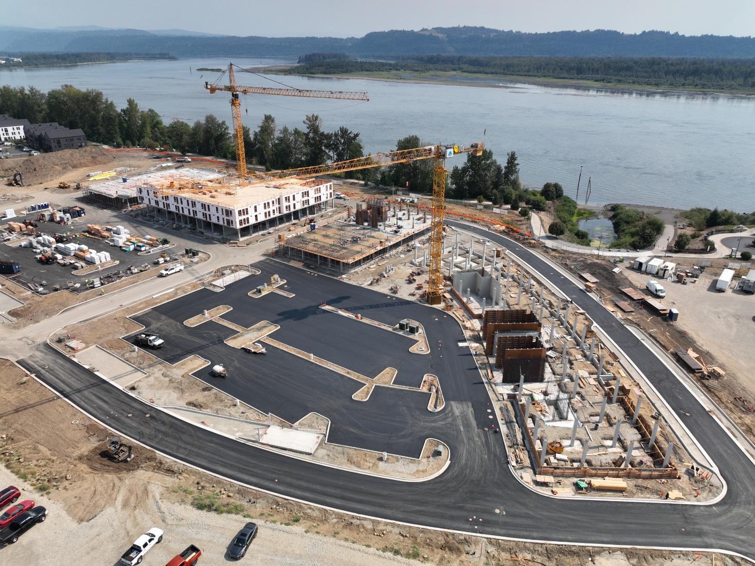 Drone view of Hyas Point apartments and retail for lease in Camas-Washougal Washington